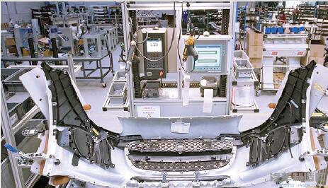 位于英国布罗姆亚德的POLYTEC 公司的捷豹F 型前保险杠的智能装配站。保险杠由增强反应注射成型聚氨酯制成(图片由POLYTEC集团提供)。