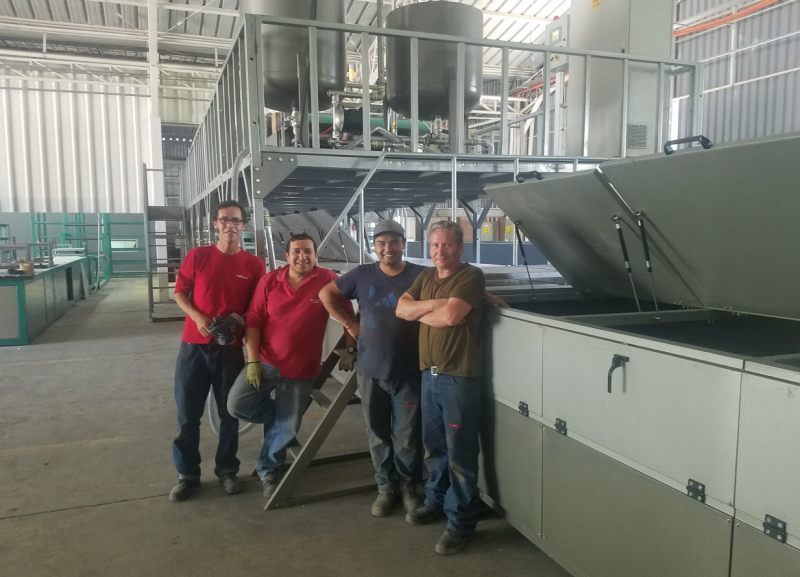 安装期间,迪诺科技业务人员与工程师拜访了85岁高龄的智利客户,老人倾注其一生打造了拥有60年历史的智利复合材料行业龙头企业,为了接待迪诺公司一行人员,老人特意在会议室准备了国旗,这让来自遥远的同行们倍感亲切,被老人细心的安排所感动,更被他饱满的工作热情所感动。