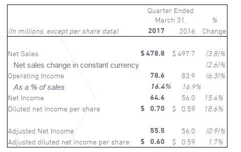 - 2017年度调整后的EPS指数维持在2.64美元至2.76美元。 2017财年的销售预计降至20亿至20.8亿美元。