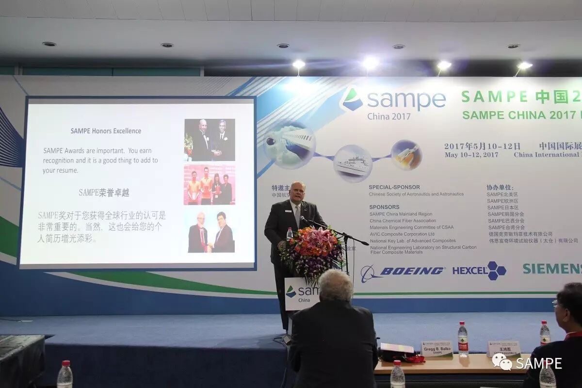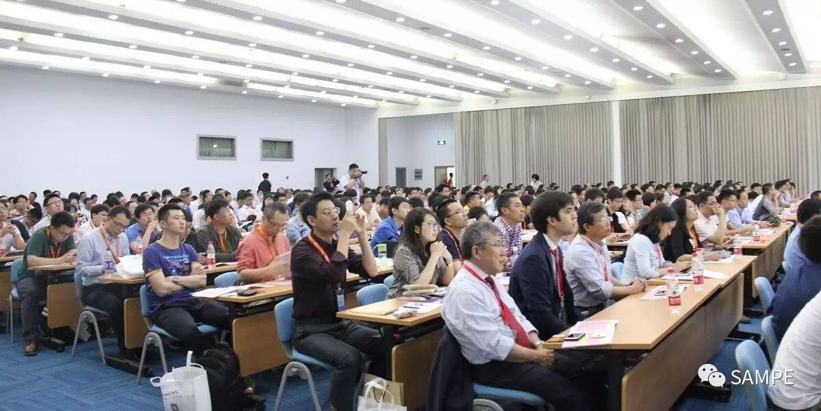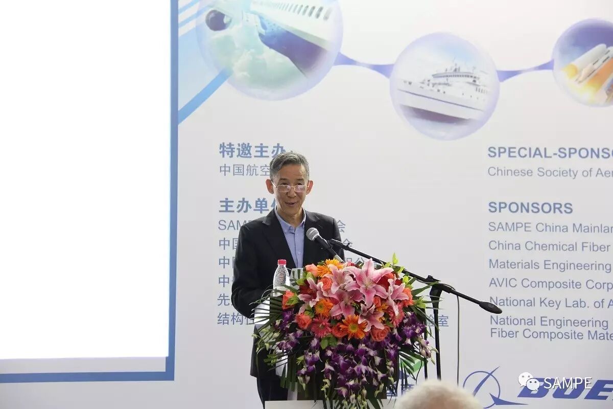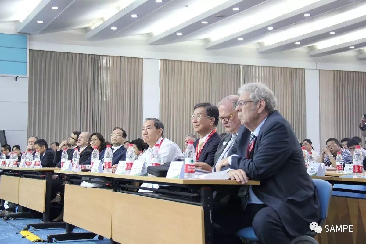 航空学会秘书长吴松先生,铁道学会理事长吕长清先生,中航复合材料有限责任公司董事长曹正华先生,化学纤维工业协会副会长贺燕丽女士,SAMPE秘书长葛瑞格 · 巴尔科先生,SAMPE技术总监斯科特 · 贝克威茨博士,SAMPE台湾分会理事长王鸿图先生,SAMPE大陆总会理事长益小苏教授,德国克劳斯玛菲技术有限公司产品经理菲利普 · 齐默尔曼博士,伟思富奇太仓公司总经理杉度 · 韦思先生等主办单位和协办单位代表参加开幕式。葛瑞格 · 巴尔科在致辞中简要回顾了SAMPE在的发展,会员服务,以及在尖端材料科技及工程应用领域所作出的引导和平台作用,同时,特别展示了SAMPE在青年材料人才培养所做出的贡献。益小苏理事长代表主办单位向所有参加年会的参会代表,参展企业表示欢迎,并简要介绍了今年年会各会场组织,会议报告,展览会展出内容,以及同期活动碳纤维体验区,超轻复合材料桥梁/机翼学生竞赛,工业DIY大赛的报名参赛情况。开幕式后,来自德国德累斯顿大学的休伯特 · 耶格尔教授作题为“低成本碳纤维制造技术,现状与未来”的大会报告。来自德国克劳斯玛菲技术公司复材产品经理菲利普 · 齐默尔曼博士介绍了“下一代热塑性RTM 及湿法模压的挑战”。包括汽车轻量化与复材应用,高性能基体树脂,设计仿真一体化与材料基因组,高性能纤维及复合材料,航空应用,风电应用,防护和特种工业应用,涂层与涂料等主题会场上午同期举办。来自、美国、德国、法国、意大利、以色列、土耳其、日本、印度、新加坡和台湾等十一个和地区的近600名代表参加大会。