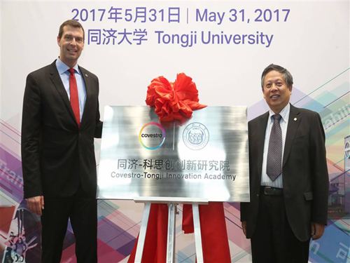 科思创负责创新的董事会成员兼席商业官施乐文博士(左)与同济大学常务副校长伍江教授为“同济-科思创创新研究院”揭牌