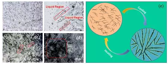 图1 相变过程中的显微结构演化。图a-d为体积分数为0.05%的复合物样品在相变过程中的光学图片。图a为液体状态,图b为固液界面区域,图c为板条状晶体区域,图d为针状晶体区域,红线所圈的范围为被挤压在晶界处而形成带状物的碳纳米管;图e为开关原理示意图。