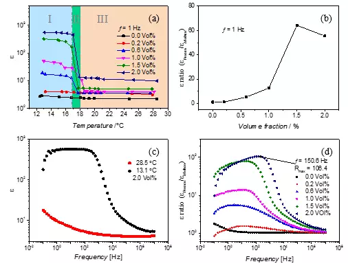 图2 复合材料的介电常数随温度、体积分数和频率的变化规律。图a为不同体积分数下,介电常数随温度的变化图;图b为频率为1Hz时,介电常数随体积分数的变化图;图c为体积分数为2.0%时,复合物在28.5˚C和13.1˚C时的介电常数频谱图;图d为在不同体积分数下,介电常数开关比的频谱图。