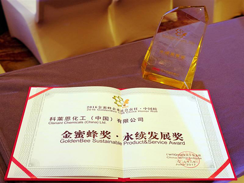上海,2017年6月8日——的特种化学品公司科莱恩近日出席了在北京举办的第12届企业社会责任国际论坛暨2016“金蜜蜂企业社会责任·榜”发布典礼,并荣获永续发展奖。“金蜜蜂企业社会责任·榜”旨在表彰在具有突出企业社会责任表现的企业。来自和境外的商业领袖齐聚一年一度的论坛,展示各自在企业社会责任方面的成果。科莱恩和科莱恩推动可持续发展的努力持续受到了业内同行的认可,今年成为荣获可持续发展大奖4家企业之一,进一步反映了科莱恩对可持续发展的坚定承诺。