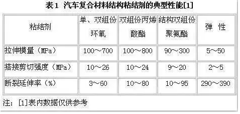 表1为汽车复合材料三类结构粘接剂的典型性能,由于结构粘结剂的品种繁多,使用的要求又各不相同,所以应以实际使用结构粘结剂的性能为准,表中数值仅供参考。