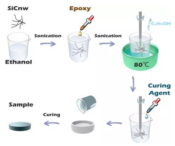 为了克服这个问题,科研人员已经开发了各种改进导热性的方法,Dianyu Shen, Zhaolin Zhan等人发现碳化硅纳米线(SiC NW)的高纵横比有利于在环氧树脂中用作填料,以达到所需的性能。他们提出了一种制备环氧树脂/ SiC NW复合材料的快速和简单的方法(图1)。使用乙醇作为溶剂,将SiC NW与环氧树脂均匀混合。随后,将混合物在水浴中搅拌,加入固化剂得到环氧/ SiC NW复合材料(图2)。