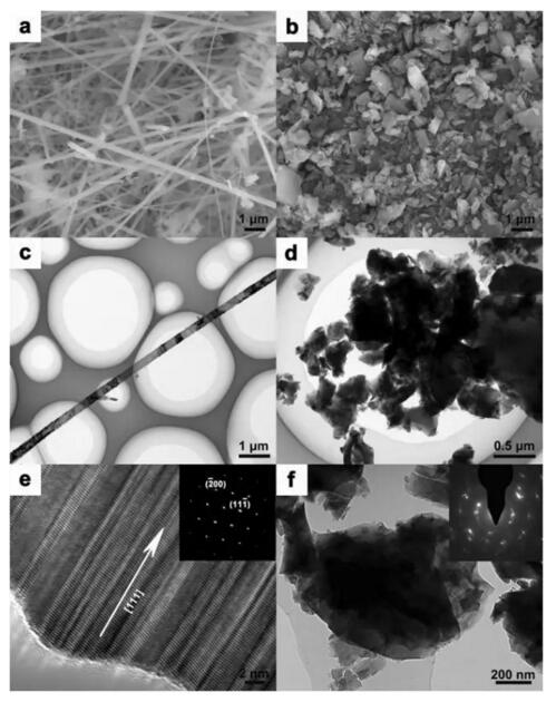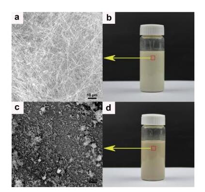 图2 (a) SiC NWs的SEM图像; (b) SiC NWs在乙醇中的图像; (c) SiC MPs的SEM图像; (d) SiC MPs在乙醇中的图像