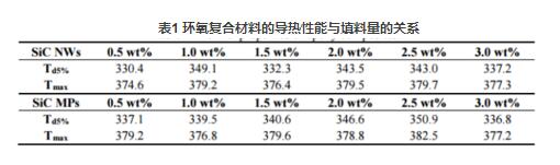 而由(图4)及(表1)可以清楚地观察到,随着SiC NW的增加,环氧复合材料的断裂面显示出显著不同的断裂图形特征。还可看出,SiC NW或SiC MPS可以提高热稳定性环氧树脂复合材料。0.1wt%的环氧树脂/SiC NW和2.5wt%的环氧树脂/ SiC MPS显示高。