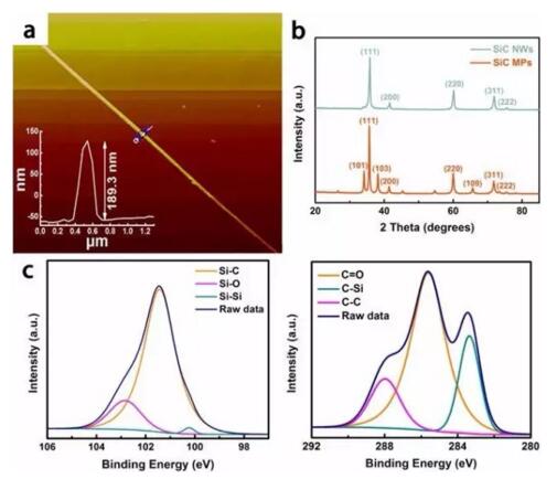 图5 (a)单个SiC NW的AFM图像;(b)SiC NW和微米颗粒的XRD图谱;(c)Si2p和C1s采用XPS分析的高分辨率结果