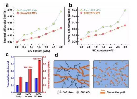 图6 (a)热扩散率对SiC负载的依赖性;(b)热导率对SiC负载的依赖性;(c)3wt%的SiC NWs载荷下,与纯环氧树脂相比复合材料的导热系数(TCE);(d)环氧复合材料的热流模型
