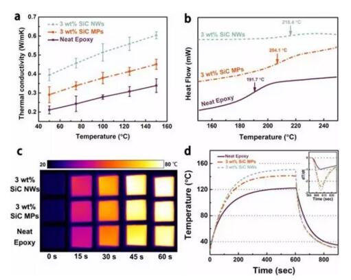 图7 (a)3wt%SiC NW的载荷下,温度对热导率的影响;(b)3wt%SiC NW负载下的纯环氧树脂和环氧/ SiC NWs的DSC;(c)纯环氧树脂和环氧树脂复合材料的传热性能的红外图像;(d)加热和冷却时,表面温度随时间的定量结果