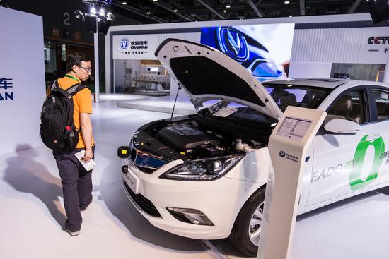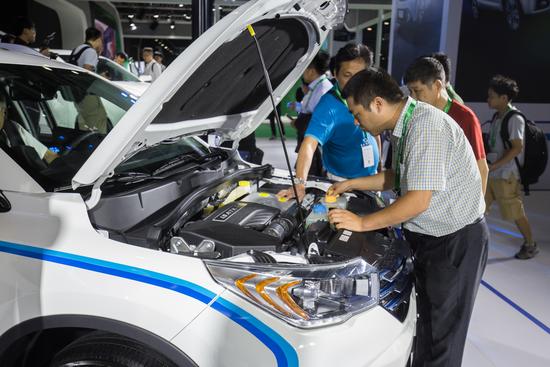 7月21日,观众在参观一辆新能源汽车。当日,2017第二届(广州)国际新能源、节能及智能汽车展在广州保利世贸博览馆拉开帷幕。新华社记者 张若玄 摄