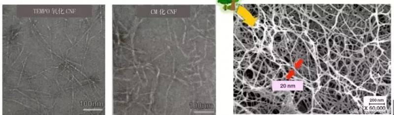 TEMPO氧化CNF、羧甲基化(CM化)CNF以及干燥的CNF粉末的扫描电镜图像。