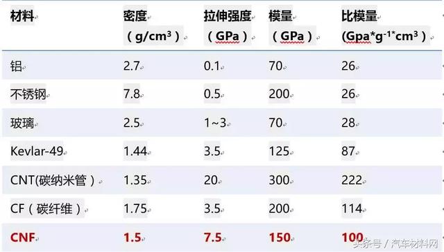 对比发现,CNF的强度和比模量远远高于铝和不锈钢,但比重只有钢的五分之一。与碳纤维和碳纳米管相比,刚度接近于碳纤维,但尺寸接近于碳纳米管,更像是一种介于二者之间的材料,而成本却要低出很多。