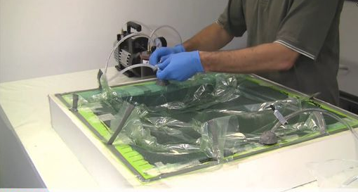 简称VIP,在模具上铺“干”碳纤维复合材料,然后铺真空袋,并抽出体系中的真空,在模具腔中形成一个负压,利用真空产生的压力把不饱和树脂通过预铺的管路压入纤维层中,让树脂浸润增强材料,后充满整个模具,制品固化后,揭去真空袋材料,从模具上得到所需的制品。该工艺在1950年就出现了记录,但在近几年才得到发展。在真空环境下树脂浸润碳纤,制品中产生的气泡极少,制品的强度更高、质量更轻,产品质量比较稳定,而且降低了树脂的损耗,仅用一面模具就可以得到两面光滑平整的制品,能较好地控制产品厚度。一般应用于船艇工业中的方向舵、雷达屏蔽罩,风电能源中的叶片、机舱罩,汽车工业中的各类车顶、挡风板、车厢等。
