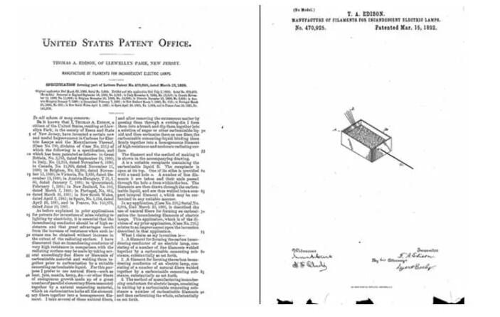 图1 1892年爱迪生获得的碳纤维长丝白炽灯丝生产技术