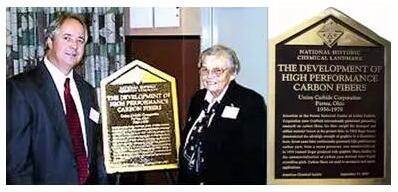 位于俄亥俄州帕尔马市(Parma,Ohio)的葛孚特国际公司(GrafTech International Ltd.)向美国化学会申报了“高性能碳纤维(High Performance CarbonFibers)”项目。该公司的前身是美国联合碳化物公司(unio CarbideCorp.)。2003年9月17日,美国化学会确认,原美国联合碳化物公司帕尔马技术中心(US unio CarbideCorp.’sParma Technical Center)曾开展的高性能碳纤维技术研究,是一项“美国历史上的化学里程碑”;罗格·贝肯(Roger Bacon)1958年发现了“石墨晶须(graphite whiskers)”及其所具有的超高强现象;伦纳德·辛格(Leonard S. Singer)1970年发明了中间相沥青基碳纤维制备技术;他们开创了碳纤维增强复合材料的科学技术基础,是该领域的开拓者。(图3、图4)