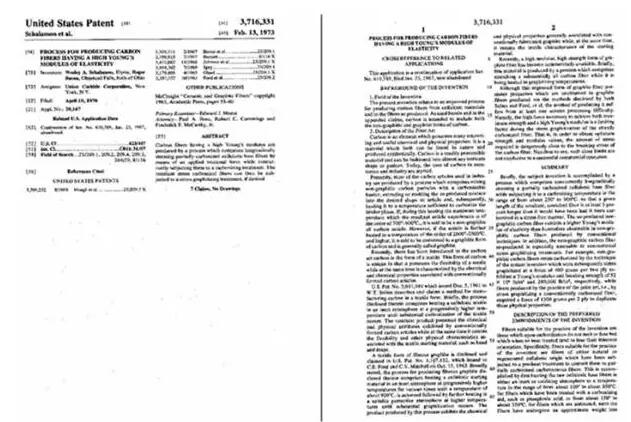 1964年,卫斯理·沙拉蒙(Wesley A. Schalamon)和罗格·贝肯一起,发明了商业化制造高模量人造丝基碳纤维的技术;2800° C以上高温下“热拉伸(hot-stretching)”人造丝,使石墨层取向与纤维轴向几乎平行;技术关键是,在加热过程中拉伸纤维,而非在达到高温之后再进行拉伸。这种工艺使纤维模量提高了10倍,是制备具有与石墨晶须相同性能的碳纤维的关键一步。1965年末,采用该技术制造的Thornel 25牌号的碳纤维投入市场。此后10多年里,美国联合碳化物公司采用高温热拉伸工艺研发出了一系列高模量碳纤维,Thornel系列产品的模量达到了830GPa。沙拉蒙和贝肯的这项发明于1973年获得了(号:3716331)(图8)。
