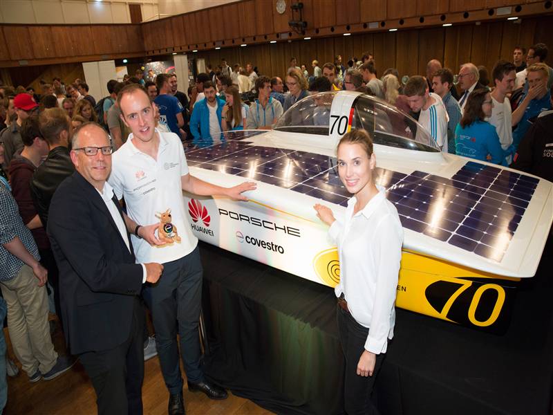 太阳能战车”团队在亚琛工业大学主教学楼庆祝战车亮相