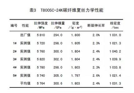 表3中测试数据表明,T800SC-24K碳纤维复丝性能复验值和出厂值相符。