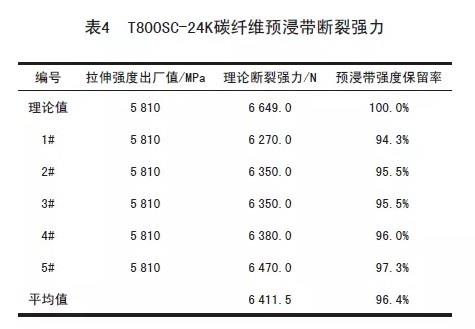 采用两轴T800SC-24K碳纤维制备预浸带。预浸带制备质量的好坏可以通过胶带断裂强力进行表征,从而测试分析预浸胶带的纤维强度保留率,具体测试结果见表4。