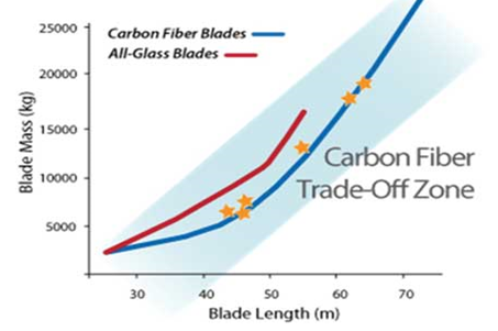 显然,新一代的技术将将涡轮机推向更高的水平,复合材料的组合将会发挥重要作用。正如ZOLTEK在分析碳与玻璃利弊时所注意到与玻璃桨叶相比可以减轻尤其是桨叶长度远远超过50米临界值的碳桨叶质量。