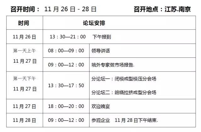 本次论坛主题是“前瞻、规划、升级”。论坛将严格落实环保法规要求,加强与国外先进技术的交流互动,特邀请美国、德国、法国、印度、土耳其等国专家到会交流指导。上午主要安排境外专家作报告,介绍本国复合材料市场现状与发展情况;使与会代表可以客观了解国外复材行业发展情况,增强做好对外贸易工作的针对性,有利企业顶层设计及调整规划,促进快速发展;下午主要安排复材工艺技术升级交流报告,设闭模成型模压分会场、缠绕拉挤成型分会场,了解国内外新技术工艺,力促企业技术水平升级。此外,会议还将安排参观目前国内碳纤维及其复合材料产业规模大的研发和生产基地-江苏恒神股份有限公司、参观掌握核心连续纤维增强热塑复合板材制备全套工艺、装备技术的江苏奇一科技有限公司、 参观其高性能热固性复合材料——SMC/BMC材料及其制品、高性能热塑性复合材料、高性能碳纤维预浸料及其制品的江苏兆鋆新材料股份有限公司及维力安智能科技有限公司自动化切割及机器人工厂。