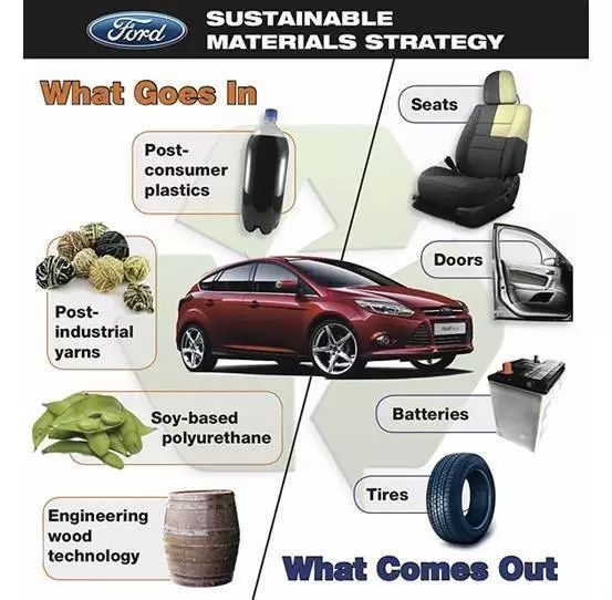 不少人可能会觉得铝合金和碳纤维还没搞明白呢,现在谈生物材料还早的很,但是近福特研发人员公布了一个惊人的消息--"目前北美所有的车辆均采用的汽车椅背、坐垫、靠枕、车厢顶篷内衬(head liner)均为大豆材质,这些材料的平均用量为18~36kg/车",该公司甚至会关注海洋内的塑料废品。