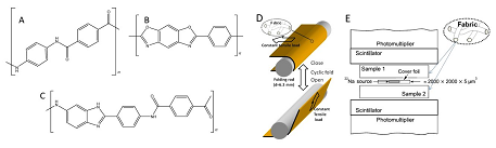 图(A)、(B)、(C)分别为PPTA、PBO和聚对苯二甲酰对苯二胺-对苯二甲酰对苯二胺(PBIA-co-PPTA)材料的化学结构;图(D)为老化弹道纤维布的织物折叠方法示意图;图(E)是用于测量材料的正电子湮没寿命光谱的设置示意图