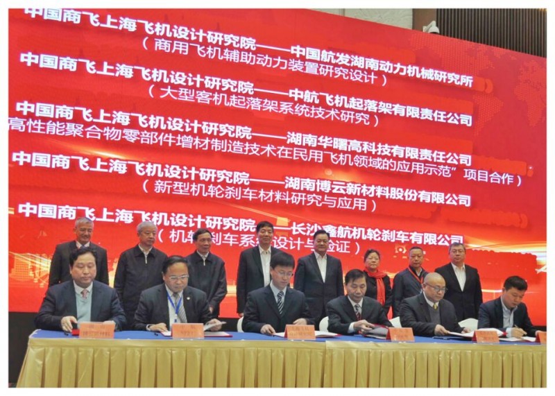 对接会上,博云新材、长沙鑫航、航发湖南动力机械研究所、中航飞机起落架公司、航天环宇、中南大学、华曙高科、兆恒材料等8家湖南航空制造业单位,与商飞上海飞机设计研究院、上海飞机制造有限公司、北京民用飞机技术研究中心签订了8个产学研合作协议,涉及国产大型客机辅助动力装置机轮刹车系统、复合材料、起落架系统、增材制造、工艺装备等领域。