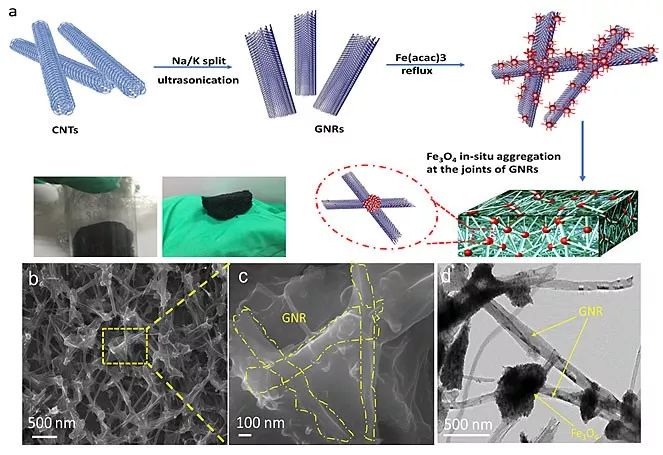 图1.(a)3D Fe3O4@GNRs的合成路线以及(b-c)SEM,(d)TEM图。