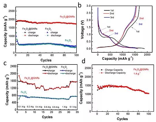 图2. 3D Fe3O4@GNRs和空白样Fe3O4电极的电池测试数据(a)0.1 A/g 电流下的循环测试,(b)3D Fe3O4@GNRs 电极的前3圈充放电曲线图,(c)3D Fe3O4@GNRs和空白样Fe3O4电极的倍率测试图,(d)3D Fe3O4@GNRs 电极在1 A/g的循环测试图。