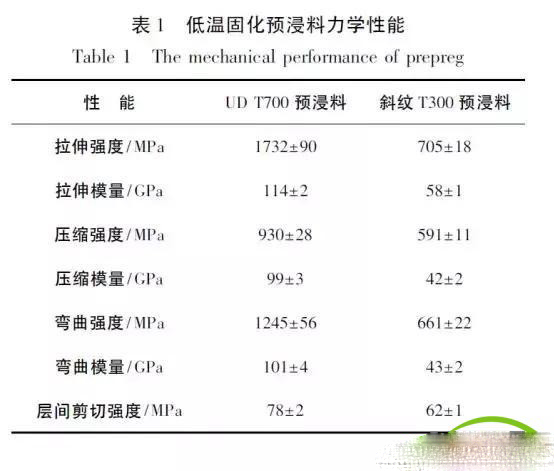 ②内部加强板,表面采用一层200 克重T300斜纹预浸布,内部采用10 层200 克重UD T700SC 预浸布按[( 0) /0 /45 / - 45 /90 /02 /90 / - 45 /45 /0]铺层设计铺设而成。低温固化预浸料主要力学性能见表1。