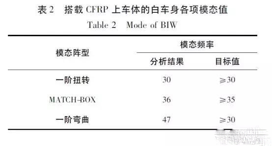 为验证上车体设计是否满足整车NVH 需求,将上车体数模搭载于原车身数模中进行模态分析,分析结果如表2 所示,均满足目标要求。1 阶扭转模态见图6。