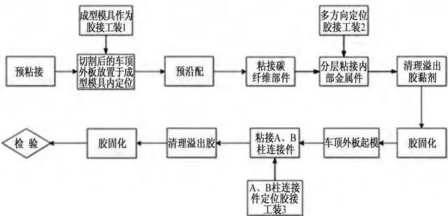 CFRP 零部件成型固化温度为80 ℃,固化时长为3 h,固化成型CFRP 零件与金属零件共同进行粘接和装配( 见图8) ,各部件的胶接采用金属框架结合玻璃钢压板的辅助工装保证胶接区域的平面度,从而保证胶接后总成的尺寸和精度,终形成CFRP 上车体。