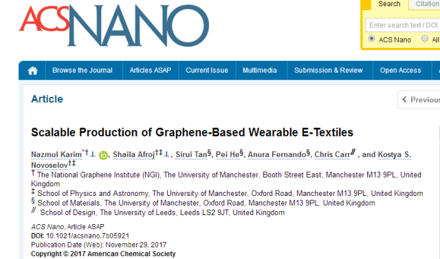 为了解决这个问题,曼彻斯特大学的KostyaS. Novoselov教授领导的一个研究小组开发了一个可扩展的工艺,以工业化大规模生产基于石墨烯的可穿戴电子纺织品。正如他们在近一期ACS Nano上发表的文章中所写的那样,该方法可以使石墨烯电纺织品以每分钟150米的商业生产速率生产。
