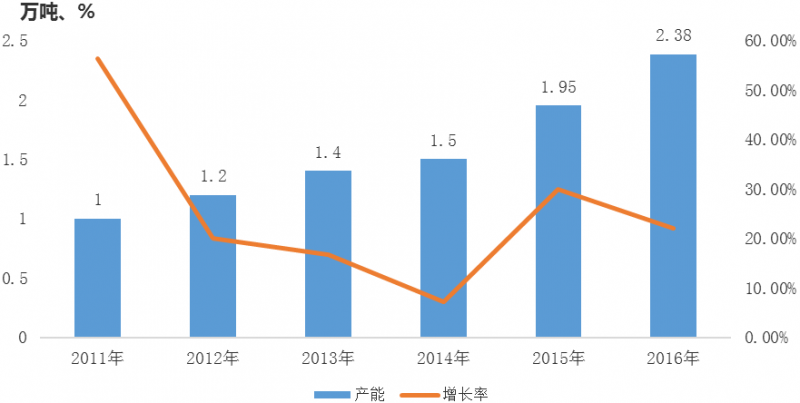 2011-2016年碳纤维产能及增长率情况