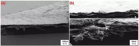 在纸基材上印刷的石墨烯RFID天线上的GO层的SEM视图。(a)大视图和(b)放大视图,层从上到下依次为GO,印刷石墨烯和纸。