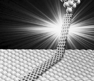 石墨烯纳米带被显微镜尖端部分悬挂起来,可见到明亮的光。