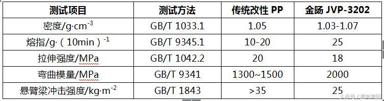 金旸JVP-3202薄壁化PP材料,该款材料可满足2.2mm保险杠机械性能要求,相比2.8mm壁厚保险杠可实现21%的减重效果。