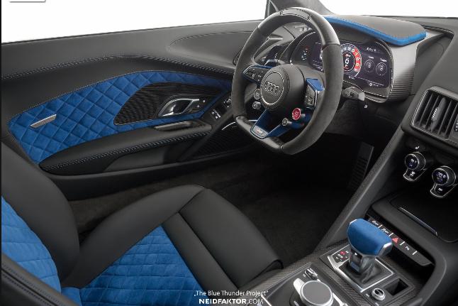 据外媒报道,Neidfaktor公司为奥迪R8设计了定制版内饰,其内饰采用了蓝色色调,其车轮及前格栅也采用了蓝色。