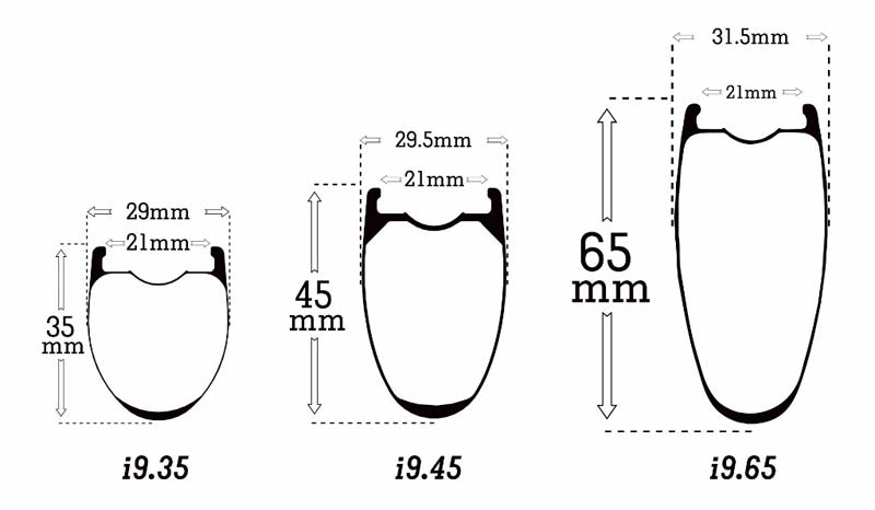 三款轮组以数字命名来描述框高。内宽均为21mm,但外部宽度根据框高的不同而有所不同,以便在安装轮胎时提供截面一致的形状。所有轮圈均为准真空设计,将会安装真空胎垫和气嘴。