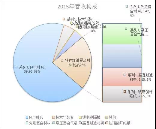 在2015年以前,公司主业集中于风电叶片,特种纤维复合材料制品和特种纤维复合材料技术与装备。2015 年中材科技主营业务收入58.3 亿元,其中风电叶片收入约40 亿元,占比68.5%,特种复合材料制品收入13亿,占比23%,包含先进复合材料(5.9%)、高压复合气瓶(6.7%)、高温过滤材料(5.4%)、玻璃纤维纸(4.5%)。特种纤维复合材料技术与装备(4.7%);锂电池隔膜收入992 万元,目前还属于新兴产品。