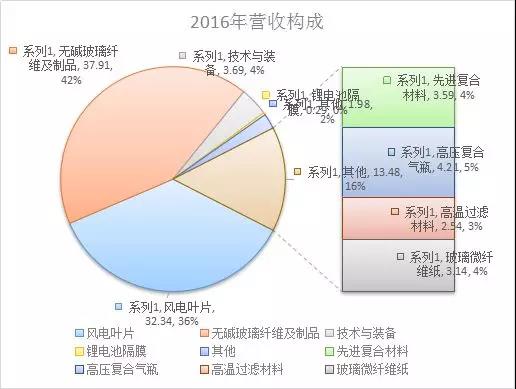 2016 年3 月,公司完成泰山玻纤收购,玻纤成为公司与风电叶片并肩的支柱产业。2016年中材科技收入90亿,其中风电叶片收入32亿元,占比36%,无碱玻璃纤维收入38亿元,占比42%,特种复合材料制品收入13.5亿,占比16%。