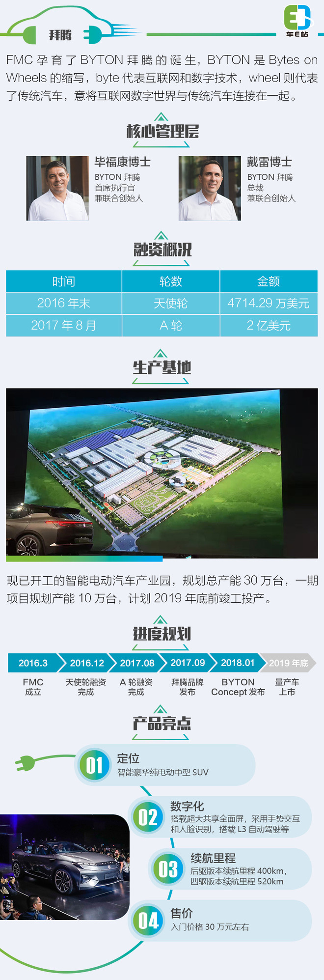 核心管理团队方面,毕福康博士在行业里如雷贯耳,加入拜腾前,他曾是宝马集团工程副总裁、i8项目总负责人,他被业界称为“i8之父”。戴雷博士是豪华汽车领域经验为丰富的高管之一,是业界公认的通。戴雷博士曾任英菲尼迪总经理及东风英菲尼迪汽车有限公司总经理。此前,他曾担任华晨宝马营销高级副总裁。