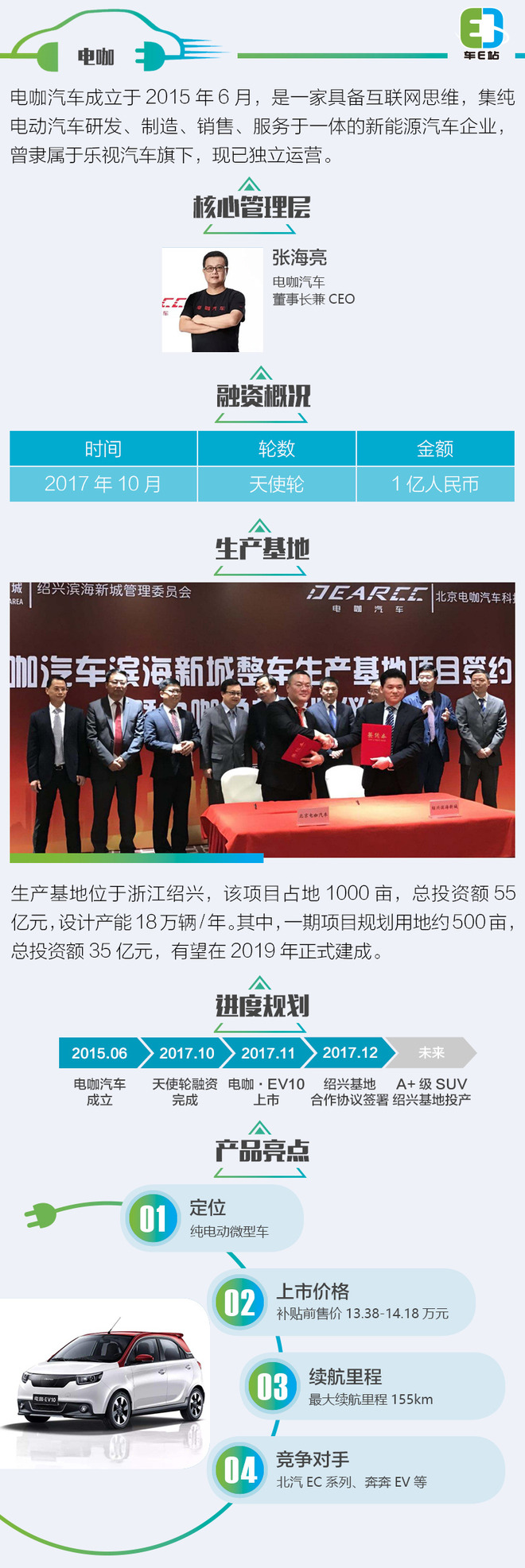 电咖汽车,曾经是乐视帝国的子公司之一,乐视曾经占股35%,是第二大股东。如今,电咖已经独立出来,张海亮执掌电咖汽车。过去的事暂且不提,已经上市的电咖汽车品牌旗下款车型EV10补贴后售价可以打入7万元市场,其是电咖与东南汽车联合推出的一款纯电动小型车。可以说,电咖汽车的顺利发展离不开与东南的合作,这款车正式由东南汽车代工生产。此外,电咖汽车后续将拥有生产资质和独立的生产基地。