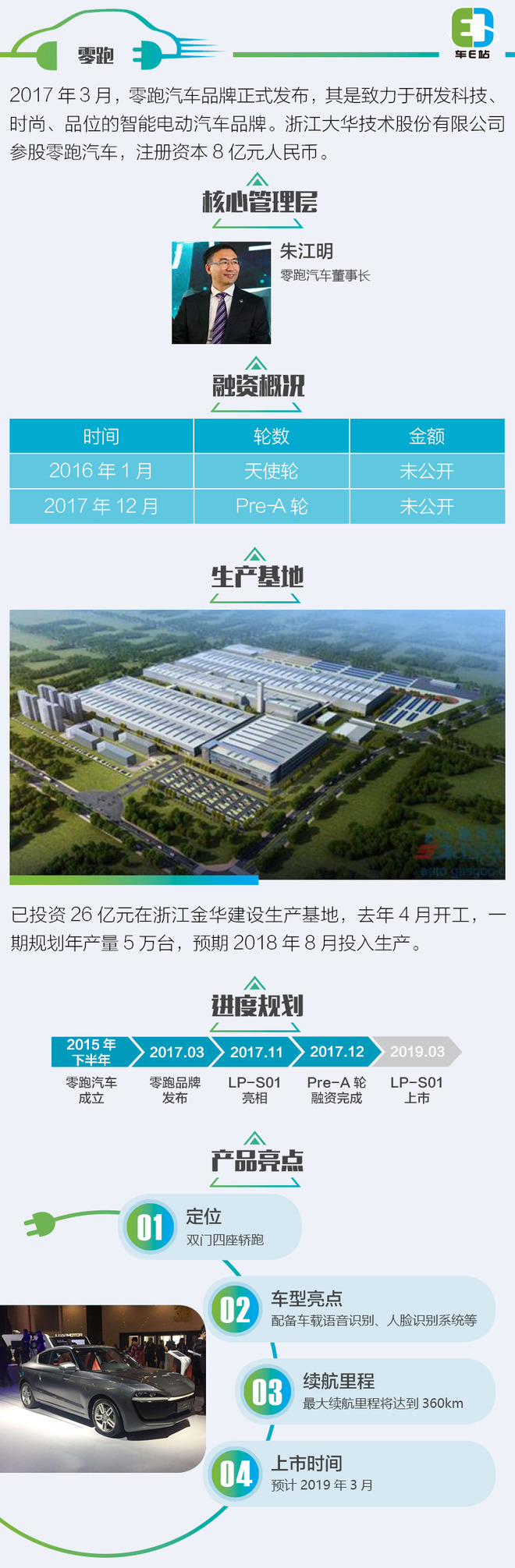 零跑汽车是跨界造车的代表,去年3月,零跑汽车品牌于浙江金华正式发布,浙江大华技术股份有限公司是监控产品的供应商和解决方案的服务商,面向提供视频存储、前端、显示控制和智能交通等系列化产品,其在安保领域排名。去年11月,零跑汽车发布了旗下款纯电动轿跑车-零跑S01,其量产版本有望于2019年3月上市,售价将在20万元上下。根据零跑的规划,其将建立三个车型平台,T平台、S平台以及C平台。不过,生产资质是摆在零跑汽车面前急需解决的问题。