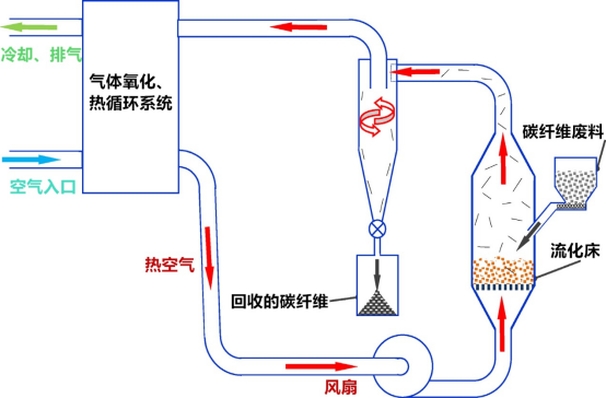 流化床工艺是指在流化床反应器内用空气作流化气体,在一定的温度下,将纤维与基体分离的方法。