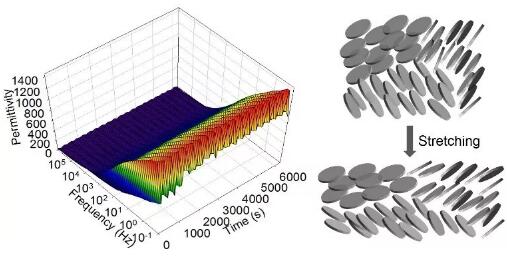 法国科研中心研究员苑金凯博士开发了还原氧化石墨烯液晶/聚二甲基矽氧烷(rGO/PDMS)电致伸缩复合材料。借助于共聚物(PDMS-b-APMS)与氧化石墨烯GO 颗粒之间的静电作用,共聚物可以将GO 从水相转移到非极性有机相中,并进一步稳定GO 在有机溶剂中的分散。这一GO 有机溶剂分散液可以直接用于PDMS 复合材料的制备。在蒸发溶剂的过程中,GO 自组装形成液晶局部取向结构。实验发现GO 在1 wt%的含量下开始形成液晶结构,但这一含量远远低于渗流阈值5 wt%。石墨烯液晶结构的形成阻止了导电网络的形成,延迟了逾渗现象,这一竞争对开发电介质复合材料极为有利。局部有序的石墨烯液晶结构可以形成非常高效的微电容结构将PDMS 基体的介电常数提高260倍,损耗却低于0.4。这一工作已经发表于Nat. Commun. 2015, 6, 8700。