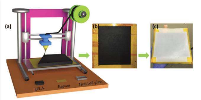 为了制造石墨烯,研究人员将石墨烯切成薄层,暴露在高频率的声波中,进行超声处理。然后与PLA结合,制成3D打印电极。